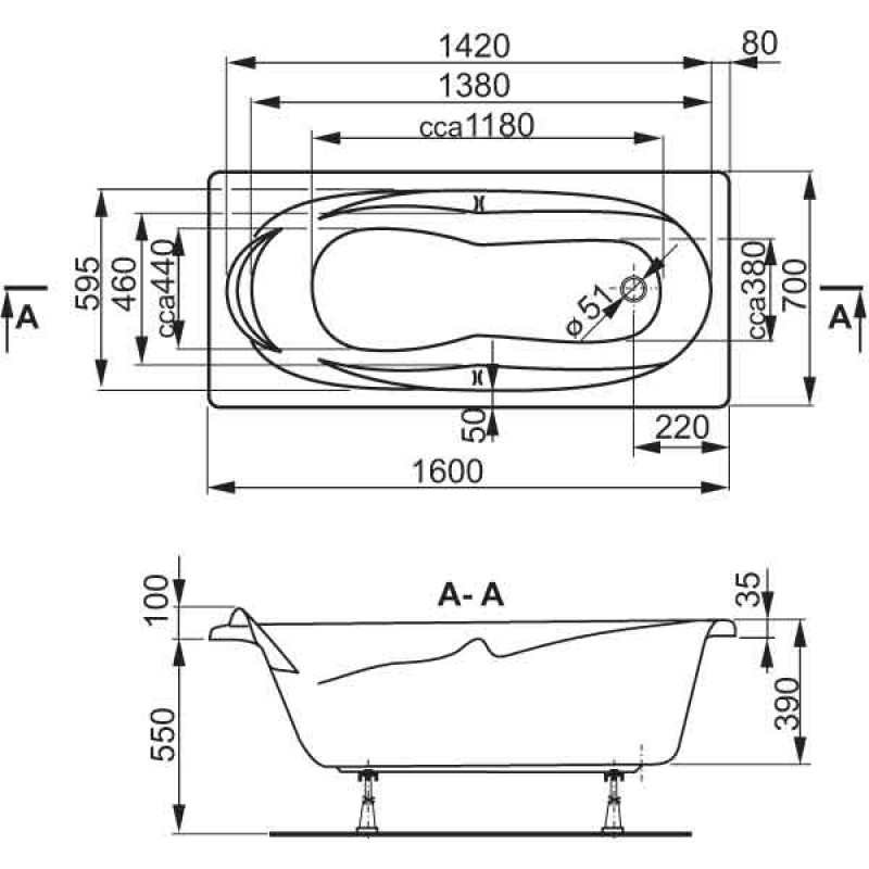 Anatomická vana s prolisy na stranách, které udržují Vaše paže při koupání v přirozené a velice příjemné poloze.