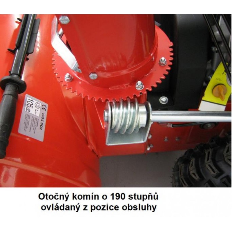 Ocelové šasí této frézy je zhotoveno z kvalitního kovu a celková hmotnost frézy je 120 kg. Ovládání pojezdu se 6 rychlostmi vpřed a 2 vzad, lze snadno regulovat pomocí ovládací páky umístěné v ovládacím panelu. Kola 15 " mají hrubý zimní dezén. Kovový výhazový komín, kterým je možné odhodit sníh do vzdálenosti až 20 m, je nastavitelný pomocí praktické páčky na levé straně v rozmezí až 190°.