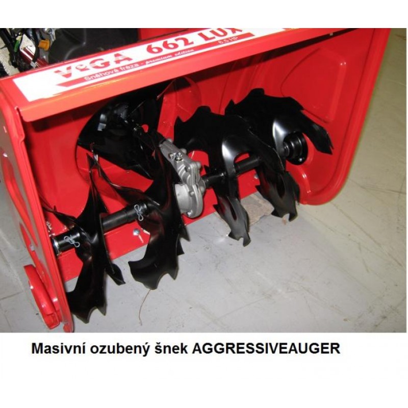 VeGA 662 Lux Motorová dvoustupňová sněhová frézaPo roce odmlky se zase na prodejní pulty vrací "bestseller" v segmentu sněhových fréz dvoustupňová sněhová fréza VeGA 662 LUX. Tento bezesporu nejúspěšnější model z rodiny sněhových fréz VeGA se vyznačuje kvalitním zpracováním a vysokým stupněm výbavy. Plynulý regulátor rychlosti CVT s aretací rychlosti GEARSTOP je osvědčeným systémem při nastavování rychlosti pojezdu a frézování. Masivní ozubený šnek AGGRESSIVEAUGER s kombinací se zimním vzorkem pneumatik SNOWGRIP si bez jakých koliv problémů poradí i s tou nejtužší sněhovou pokrývkou. Srdcem této dvoustupňové frézy je osvědčený silný OHV motor o výkonu 6,5 HP s možností elektrického startování 230V/50Hz..Při páci za šera, nebo sněhové vánici obsluha uvítá nastavitelný halogenový reflektor.