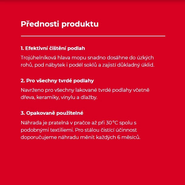 Trojúhelníková hlava mopu bez námahy dosáhne do rohů, pod nábytek i podél soklů, takže zajistí důkladný úklid každý den.