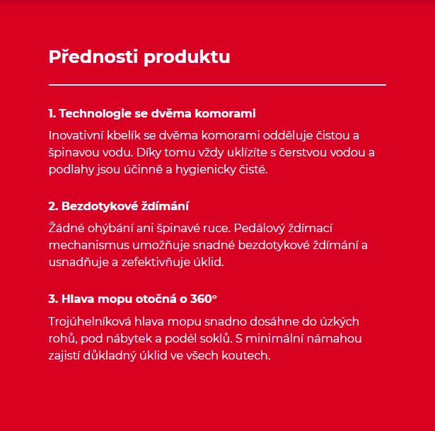 Systém rotačního mopu a kbelíku Vileda H2Pro využívá inovativní kbelík se dvěma komorami, který zajišťuje oddělení čisté a špinavé vody pro účinnější úklid. Bezdotykový ždímací mechanismus aktivovaný pedálem umožňuje snadno regulovat vlhkost mopu.