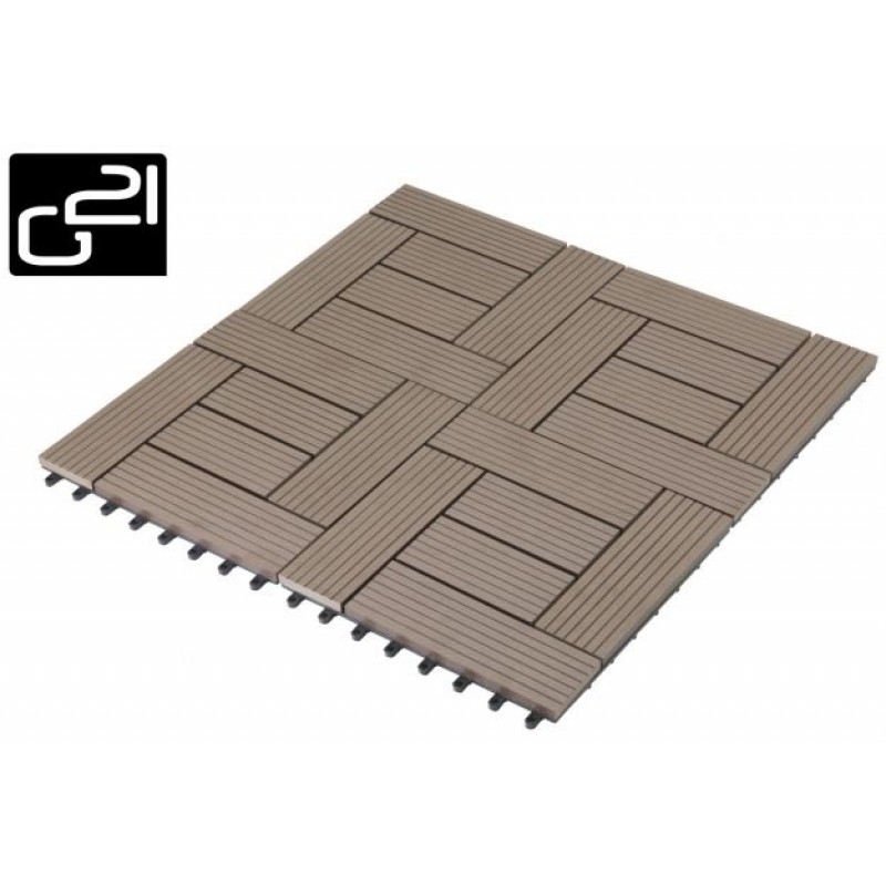 WPC dlaždice G21 Samoa jsou součásti komplexního podlahového systému G21 a jsou praktickým řešením pro použití na exterierové podlahové krytiny. Komplexní podlahový systém G21 je cenově zajímavé řešení, které však zároveň splňuje i vysoké kvalitativní nároky. Bezúdržbovost, barevná stálost, odolnost proti povětrnostním podmínkám, vhodnost použití ve vlhkých podmínkách, praktická montáž jsou atributy, které v porovnání s dřevěnými podlahovými prkny výrazně posilují argumenty pro použití kompozitního dřevoplastového podlahového systému G21. Použitý WPC materiál je díky svým vlastnostem velmi výhodný pro použití na venkovní terasy, pochozí plochy okolo bazénů, podlahy balkónů, kde dochází k působení všech běžných vlivů venkovního prostředí (vlhko, sluneční záření, vítr, mráz). Zkratka WPC ( wood plastic components ) značí, že jde o směs dřevitých vláken a plastu v poměru 60% dřevitá vlákna : 40% plast vytvářející procesem extrudace praktický a po všech stránkách vysoce užitkový materiál, jehož vlastnosti dosahují kvalit prken z exotických dřevin a zároveň jsou však výrazně cenově dostupnější. Podlahy a terasy položené s použitím kompozitního systému G21 tedy navenek vypadají jako ze dřeva, ale není potřeba žádné údržby, nátěrů a oproti klasickému plastu mají zase vysokou stálobarevnost a jsou odolnější vůči teplotním výkyvům. WPC terasové dlaždice mají velice snadnou a rychlou montáž i demontáž, jednoduše je sesadíte k sobě pomocí plastových zámků.Ještě nikdy nebyla takto kvalitní podlahová krytina levnější.