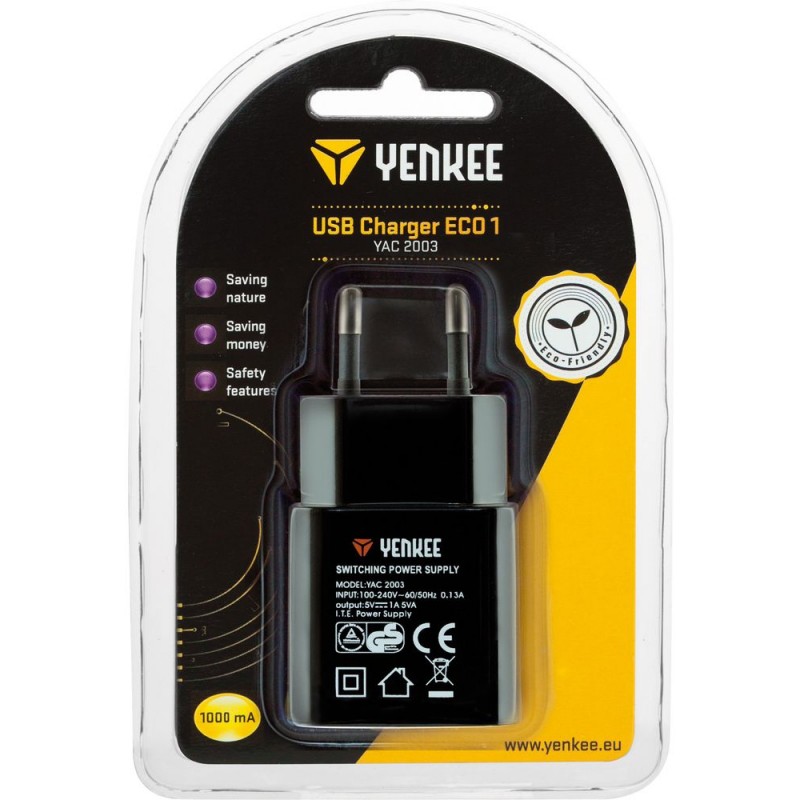 YENKEE YAC 2003BK USB Nabíječka 1000 mA 45007865Síťová nabíječka s USB výstupem. Zahrnuje několik bezpečnostních funkcí, jako ochranu proti zkratu nebo automatické vypnutí při přetížení. Dokonalý společník na cesty.