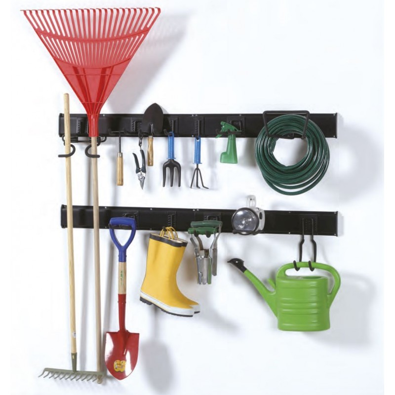 Držák na nářadí je jednoduchý na připevnění a umožní bezpečné zavěšení téměř každého druhu nářadí. Je opatřen gumovým návlekem a zavěšuje se na závěsnou lištu s rozměrem 61 x 10 cm, kterou lze spojovat spojnicí a zakončit plastovou záslepkou.