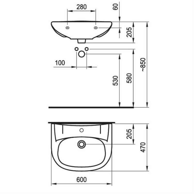 Umyvadlo 60x47 cm, otvor pro baterii uprostřed. Jde o samotné umyvadlo beze sloupu.Ilustrační foto.